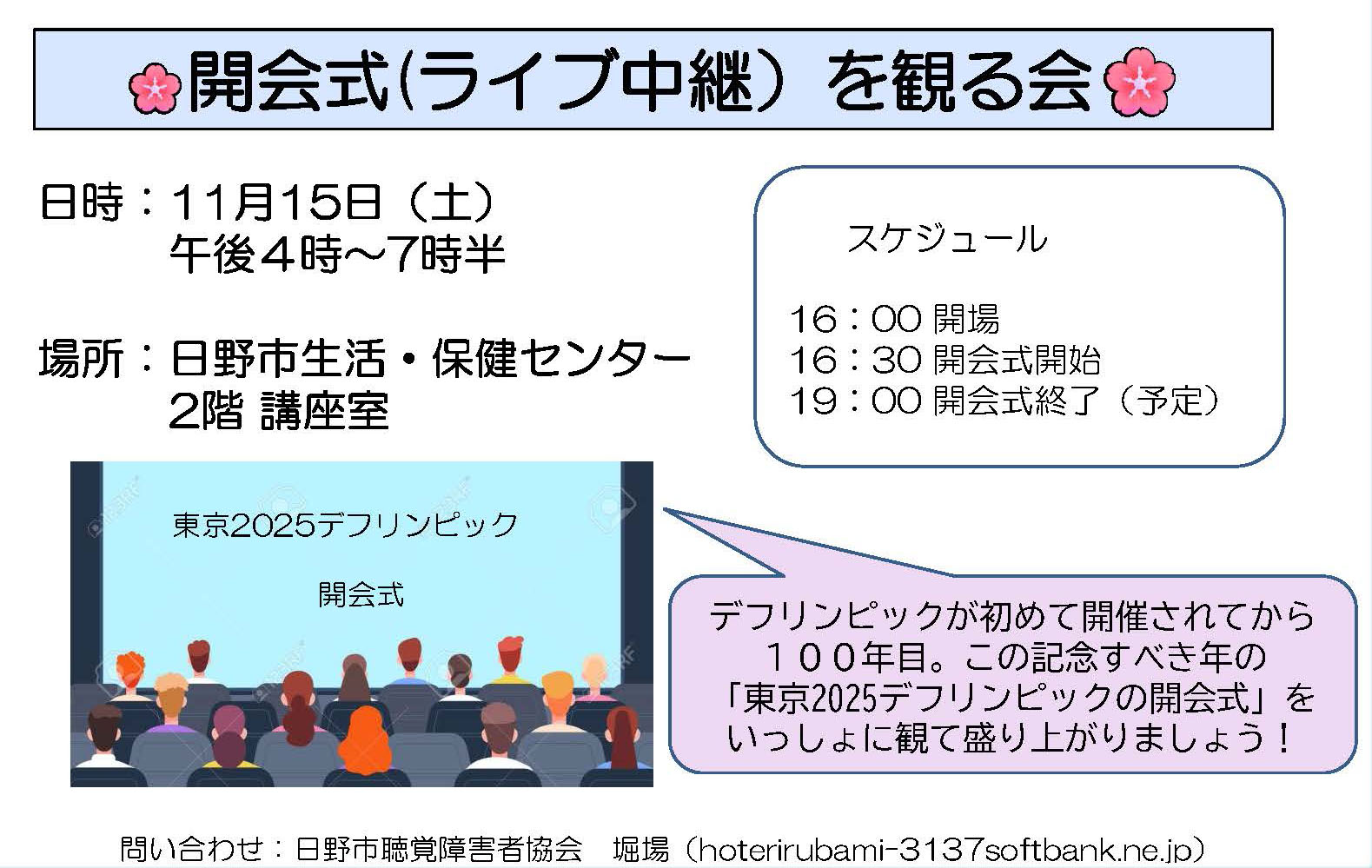 内容:①オープニング、②豊島区聴覚障害者協会挨拶、③来賓挨拶、
