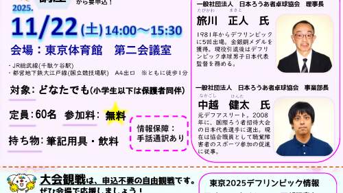 当講座は、デフリンピック卓球団体戦の前日11/22(土)に、日本ろうあ者卓球協会理事長の旅川様、事業部長の中越様にご登壇いただき、団体戦の見どころや注目選手等を、ご自身の体験談などを交えながらお話しいただく講座となります。