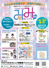 日時:2025年9月13日(土) 10時~16時 会場 東京都立大学 荒川キャンパス 参加費無料・事前申込不要(教室プログラムのみ事前申込制) 主催:東京都 協力:東京都聴覚障害者連盟/東京都中途失聴・難聴者協会 公...