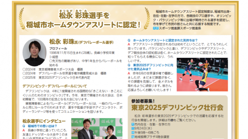 松永彩珠選手(デフバレーボール)が稲城市ホームタウンアスリートに認定されました。 「稲城市ホームタウンアスリート」は、市にゆかりのある選手を応援し、その活躍を市民の元気や希望につなげる制度です。松永さんは“稲城の星”として、世界に羽ば...